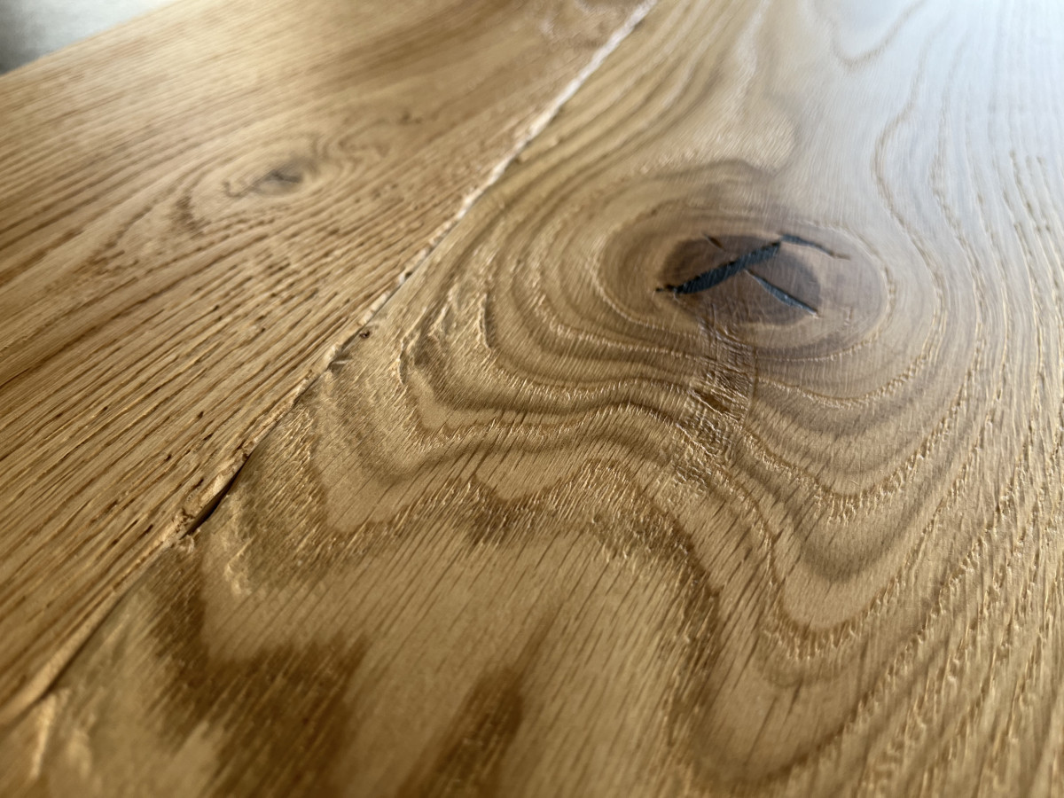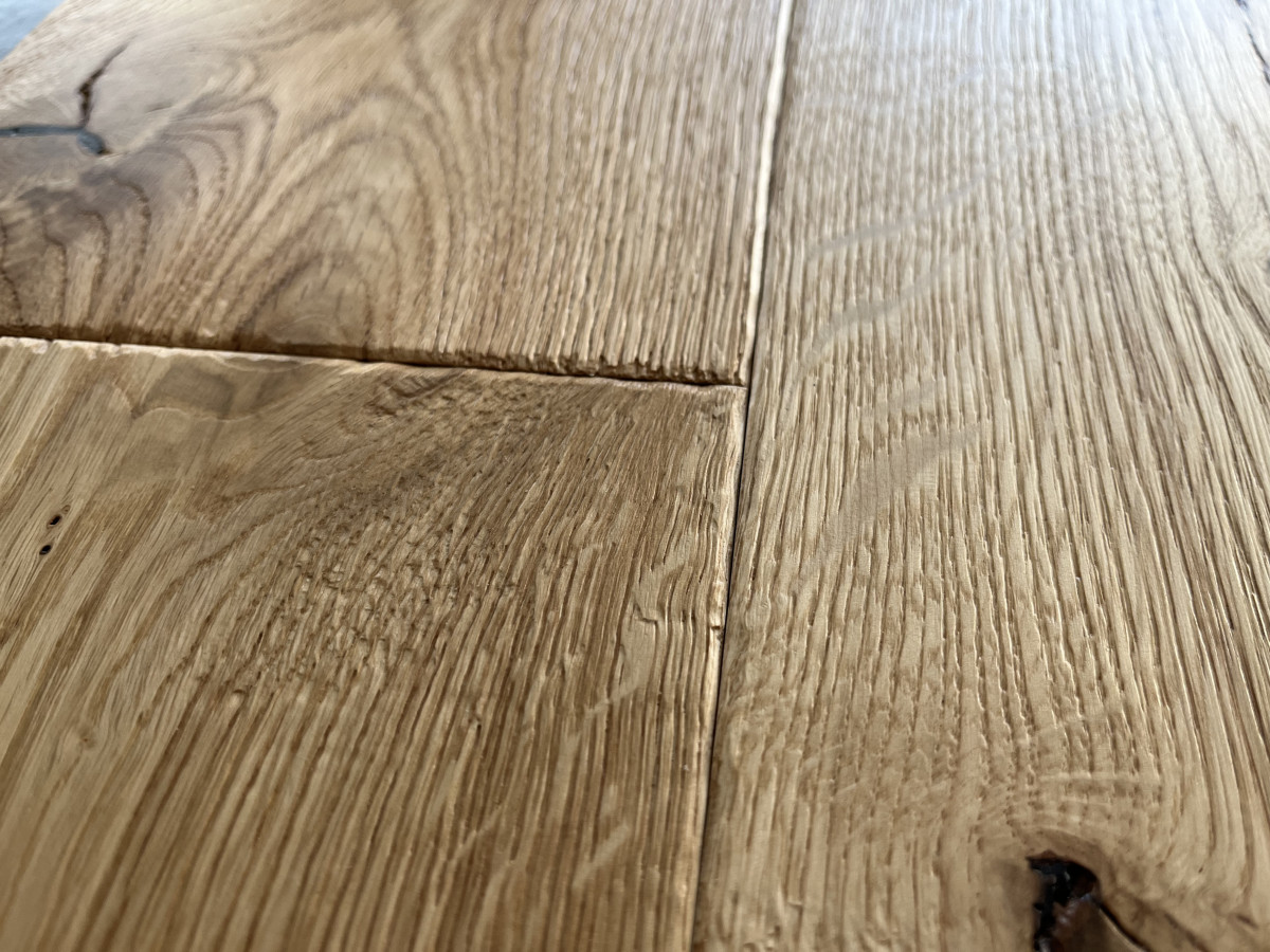 Každé prkno je originál. Ručně hoblovaný povrch v kombinaci s kartáčováním vytváří plastickou strukturu, která reaguje na světlo i pohyb. Černé suky dodávají podlaze výrazný, lehce industriální charakter – ideální pro moderní i nadčasové interiéry.